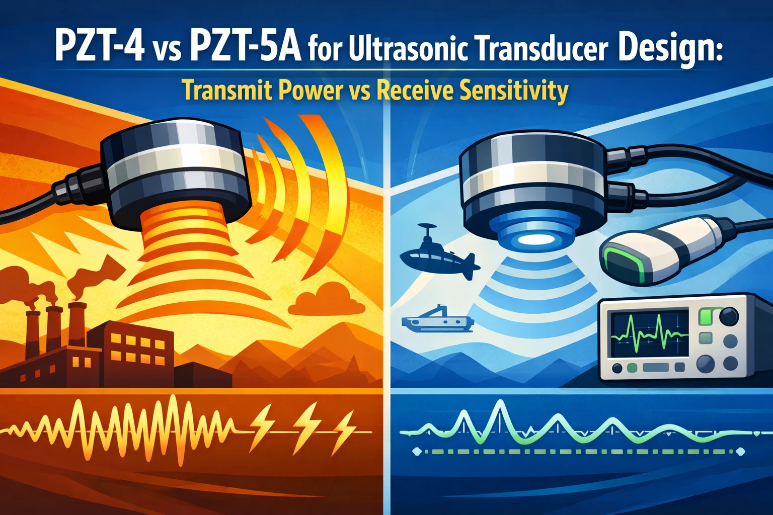 PZT-4 と PZT-5A を、Qm、誘電損失、帯域幅、熱余裕、トランスデューサ構造の観点から比較する、送信系と受信系のための設計選定メモです。